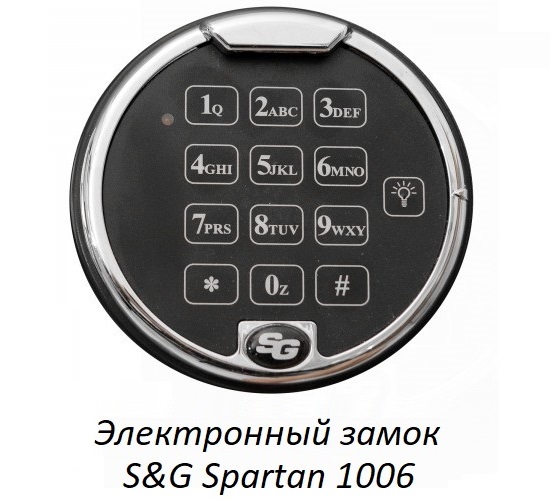 - На дверь установлен американский электронный замок Sargent&Greenleaf, модель Spartan 1006, обладающий сертификатами: VdS Class 2, UL Type 1, CEN B и т.д. Замок защищён от подбора кода и допускает до миллиона кодовых комбинаций.